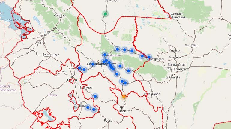 Los puntos de bloqueo están distribuidos de la siguiente manera: 4 en la carretera que va desde Cochabamba al occidente del país; 6 en la carretera nueva a Santa Cruz; 4 en la carretera antigua al oriente y 6 en la ruta hacia el sur.