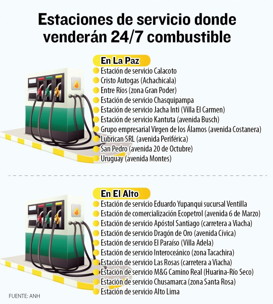 En La Paz estarán habilitadas las estaciones de servicio Calacoto; Cristo Autogas S.R.L.; Chasquipampa S.R.L.; Jacha Inti S.R.L.; Entre Ríos; Uruguay; Lubrican S.R.L.; Virgen de los Álamos S.R.L.; Kantuta S.R.L y San Pedro.