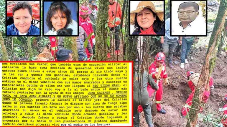 En la declaración también reveló que en el momento del asesinato: “La base toma la decisión de quemarlos vivos. Nos dicen: Ustedes cinco lleven a estos cinco perros al río Tizón Mayu y les queman con gasolina. Los estábamos llevando, Cristian conducía el vehículo, todos estaban en el auto amarrados y nosotros en motocicletas por detrás”.