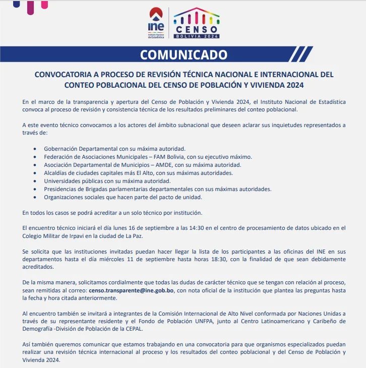 Con el objetivo de brindar aclaraciones a las dudas sobre los resultados entregados en el informe preliminar, el INE ha invitado a los actores del ámbito subnacional puedan acudir el próximo lunes a las 14:30 en el centro de procesamiento de datos ubicado en el Colegio Militar de Irpavi en la ciudad de La Paz.