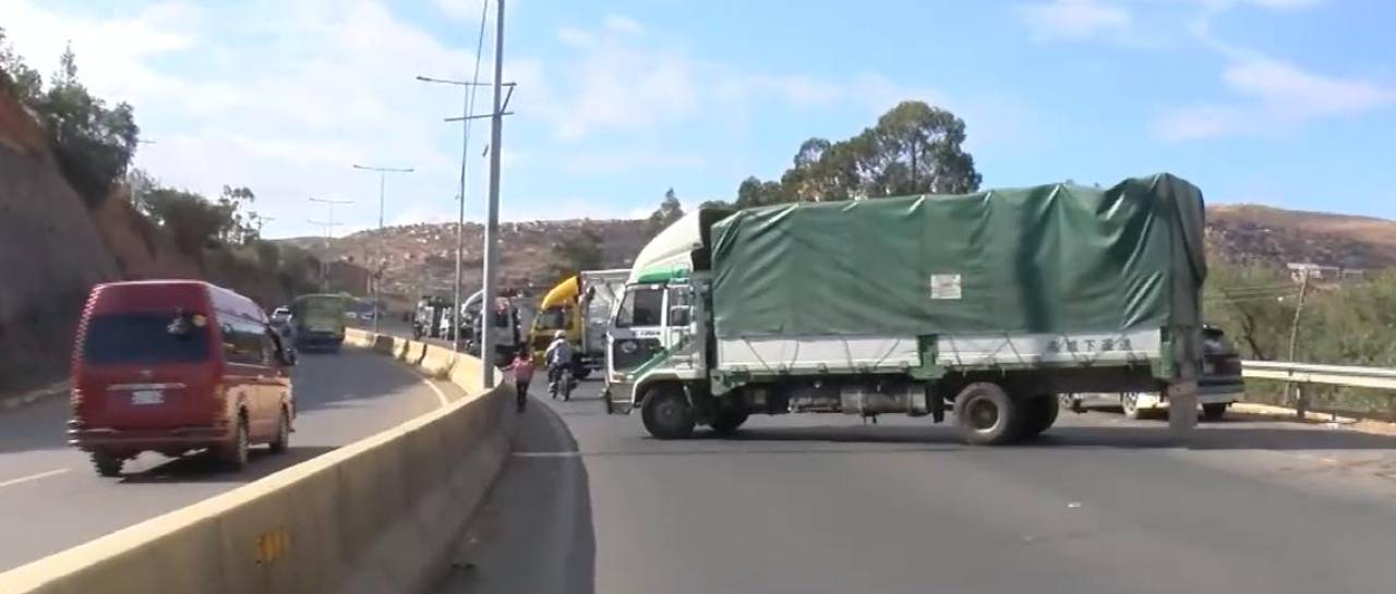 Choferes del transporte pesado instalaron un bloqueo a la altura del kilómetro 7 de la avenida Petrolera, zona sur de la ciudad de Cochabamba y vía que conecta hacia la zona del Valle Alto.
